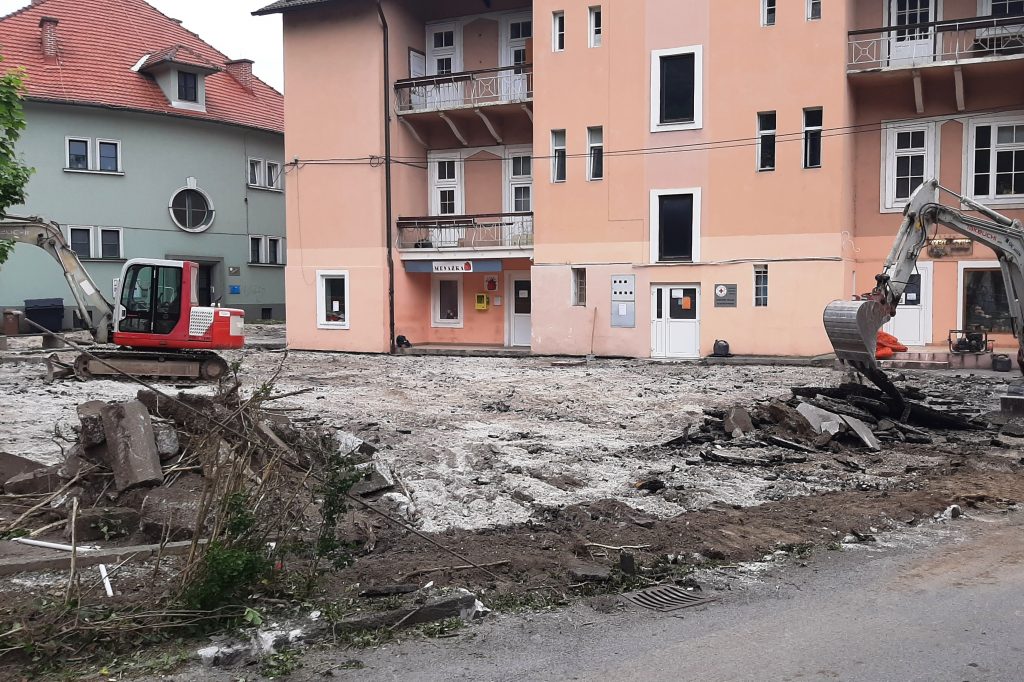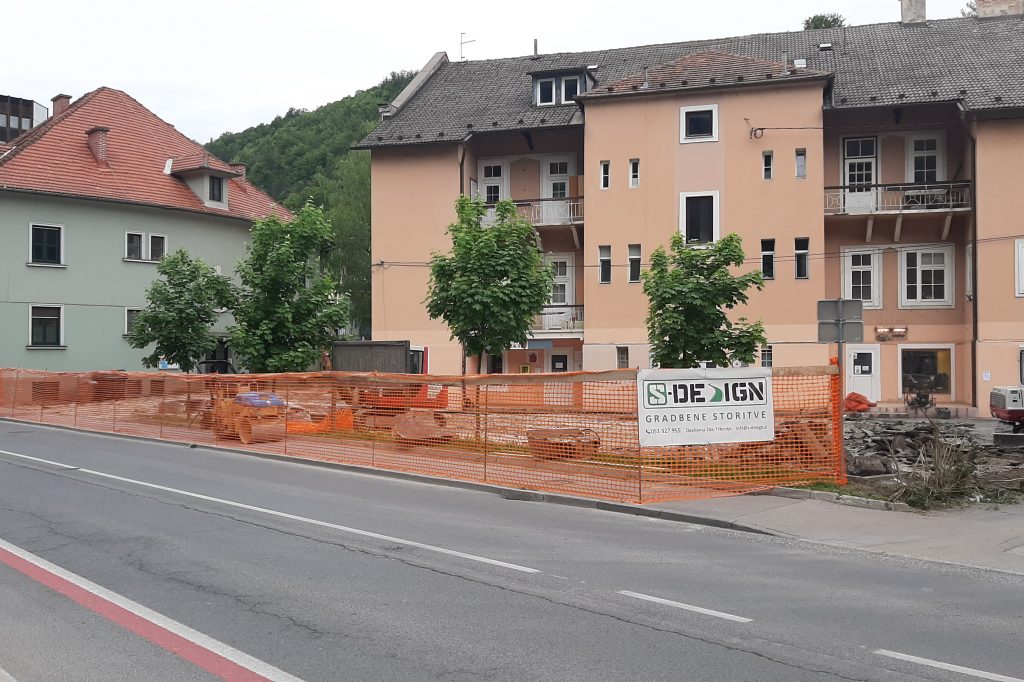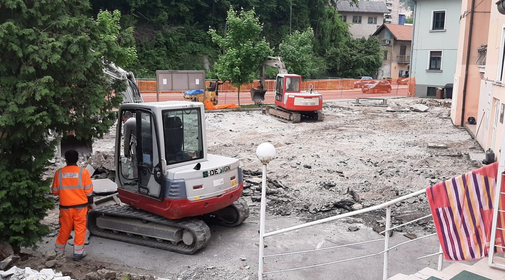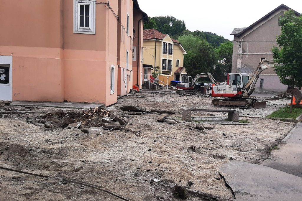 V teh dneh so v Trbovljah na Ulici 1. junija 4 delovni stroji zabrneli tudi na spodnji strani stavbe, kjer so območni Rdeči križ, Menažka in nekateri drugi. Ureja se zelo dotrajano parkirišče pred objektom.