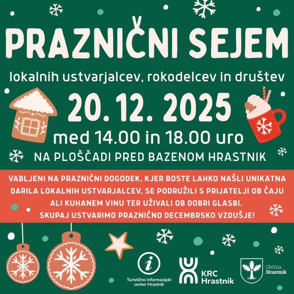 Organizatorja KRC Hrastnik izredno veseli, da bo praznični sejem, ki ga letos v samostojni obliki prirejajo prvič, zelo bogat, saj bo sodelovalo kar 19 ponudnikov, ki bodo predstavili svoje izdelke in ustvarjalnost. Na stojnicah bo na voljo vse vrste prazničnih daril. Za lakoto pa bodo poskrbeli člani letošnje zmagovalne ekipe na festivalu Funšterc – Funšterctim iz Prosvetnega društva Čeče.