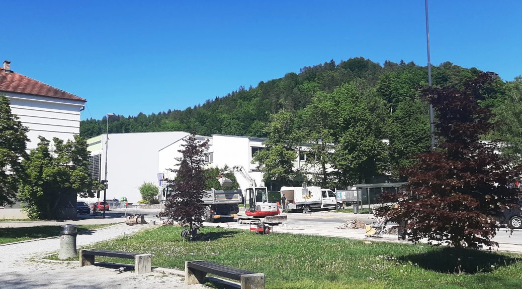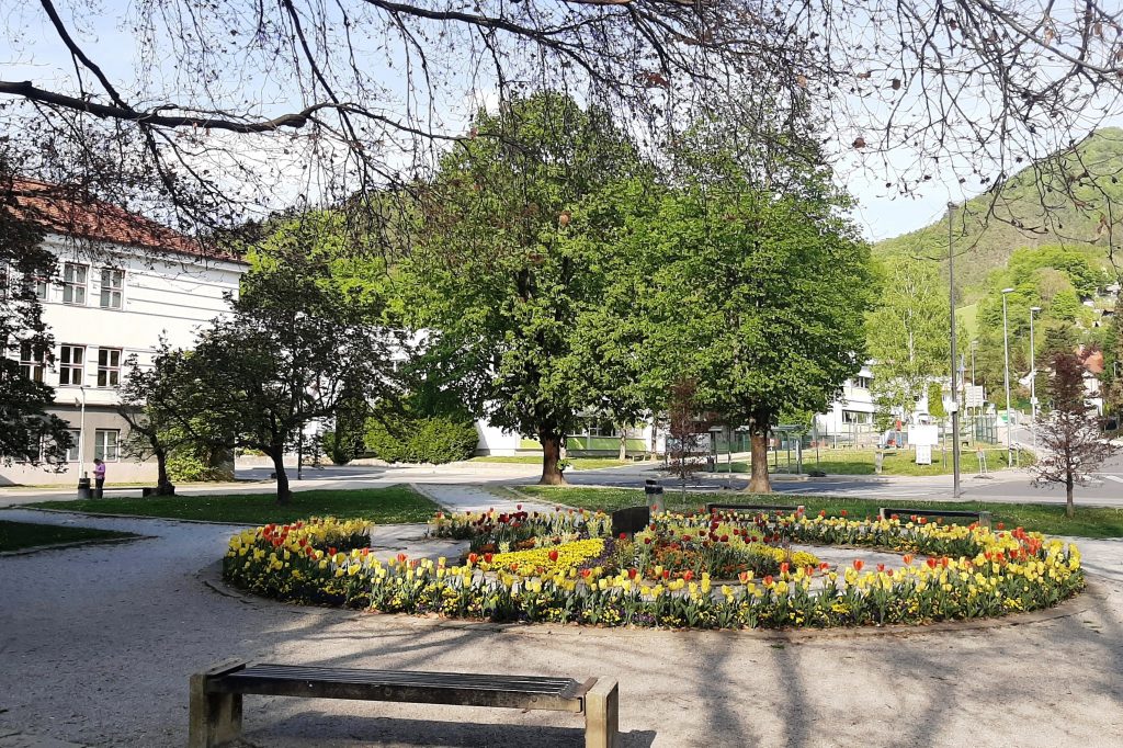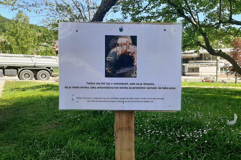 V parku pred občinsko stavno je nameščena tudi tabla s fotografijo in pisnim obvestilom o poseku lip ter vzrokih zanj.