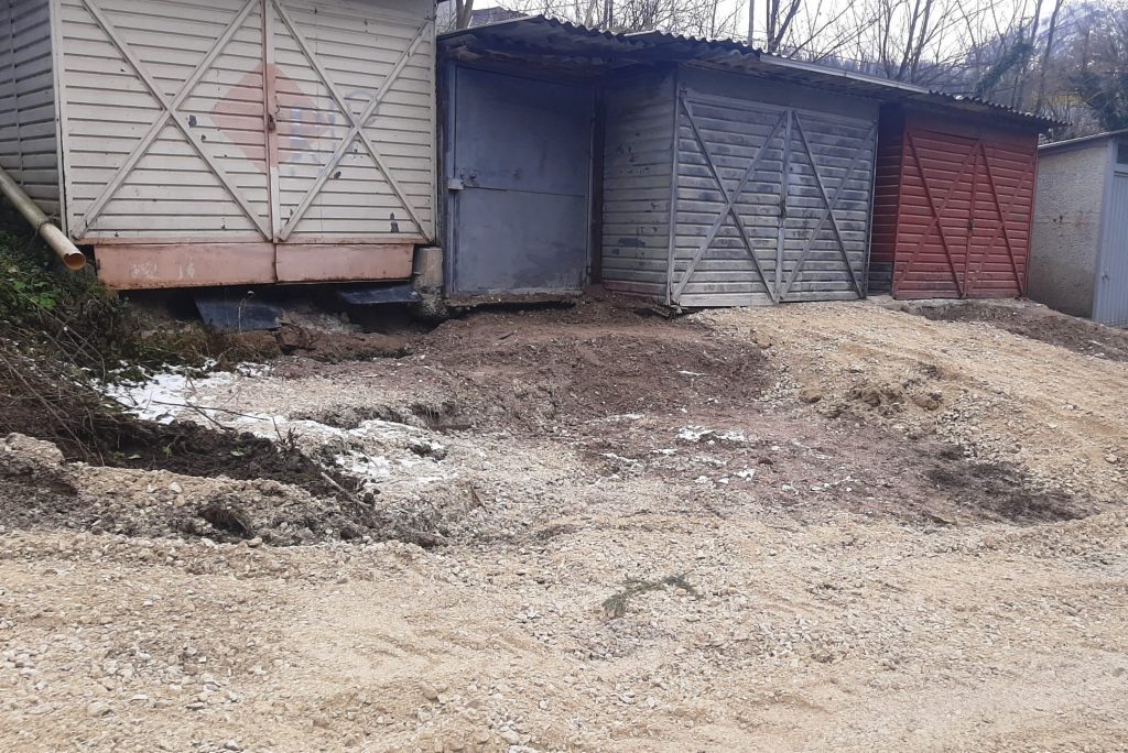 S strani investitorja Toming inženiring iz Velenja so sicer že delno sanirali posledico plazu. Kot pravijo krajani, so dvakrat pripeljali in na dovozno pot nasuli večjo količino peska. Kljub temu pa je nekatere imetnike razjezilo, da so po dosedanji začasni sanaciji z mrežo zaprli cesto in onemogočili prehod. Mreža je po dveh dneh od postavitve sedaj odstranjena. Uporabniki garaž in vrtov pričakujejo, da bo investitor poskrbel za odpravo posledic in za preprečitev nadaljnjih težav. So stališča, da mora lastnik tolerirati tudi uporabnike in ne povzročati škode brez sanacije. Problem na omenjeni lokaciji pa ni le zdrs in pogrezanje brežine in ceste, ampak tudi objekti nad cesto in plinovod. Nad garažami so ob glavni cesti čez Ajnzer tudi drugi objekti in sicer avtodelavnica, pralnica avtomobilov in prostori avtošole. V kolikor razmere ne bodo sanirane kot potrebno, se utegnejo posledice razširiti tudi nanje. Veliko nevarnost po zatrjevanju krajanov predstavlja tudi plinovod, ki je speljan tako rekoč tik mimo.